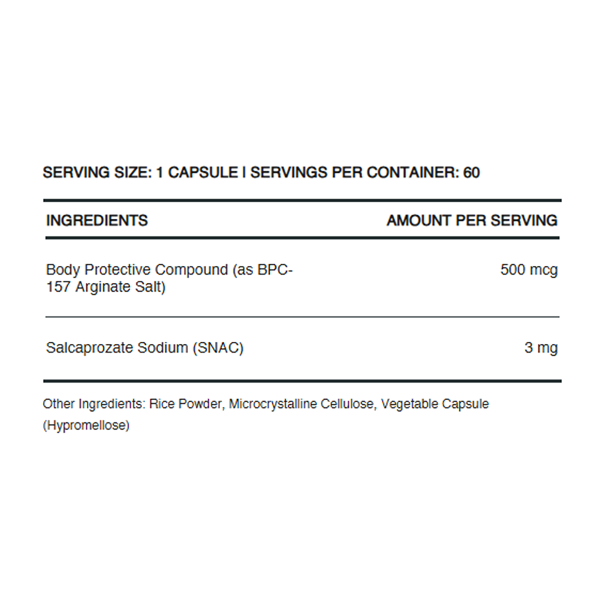- Active ingredients: Body Protective Compound (BPC-157), salcaprozate sodium (SNAC)