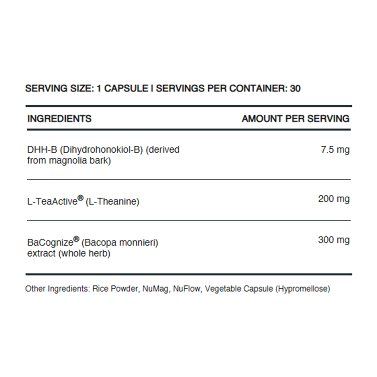 This formula is designed to support relaxation, mental clarity, and overall cognitive well-being. It combines three key ingredients—L-TeaActive®, BaCognize®, and DHH-B (Dihydrohonokiol)—that work synergistically to promote calm, support cognitive function, and maintain a balanced stress response. Each ingredient has been carefully selected for its unique properties and potential to contribute to a sense of tranquility and mental vitality.
