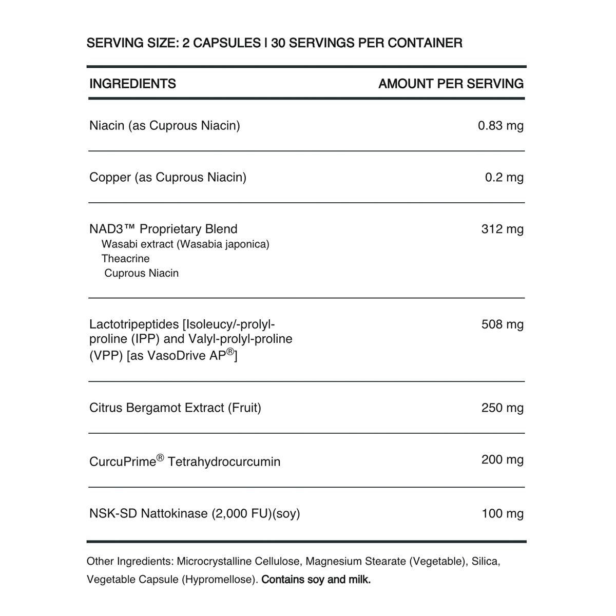 VasoDrive-AP® (AmealPeptide) - Rounding out this formulation and staying true to our peptide roots, we’ve included a tripeptide in Cardio Prime+. The role of peptides in cardiometabolic health is well documented and V asoDrive-AP®, derived from casein (milk protein), and consisting of two lactotripeptides - V aline-Proline-Proline (VPP) and Isoleucine-Proline-Proline (IPP) (both of which have been shown to help optimize blood vessel constriction, which in turn, aids with blood flow) represents one of the most innovative peptides available..