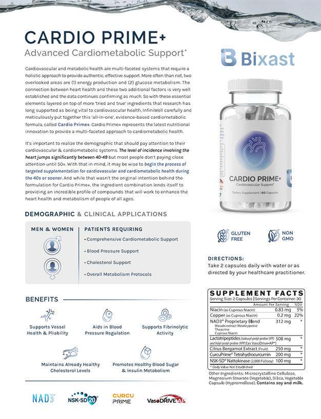 Cardiovascular and metabolic health are multi-faceted systems that require a holistic approach to provide authentic, effective support. More often than not, two overlooked areas are (1) energy production and (2) glucose metabolism. The connection between heart health and these two additional factors is very well established and the data continues confirming as much. So with these essential elements layered on top of more ‘tried and true’ ingredients that research has long supported as being vital to cardiovascular health, Bixast carefully and meticulously put together this ‘all-in-one’, evidence-based cardiometabolic formula, called Cardio Prime+. Cardio Prime+ represents the latest nutritional innovation to provide a multi-faceted approach to cardiometabolic health.